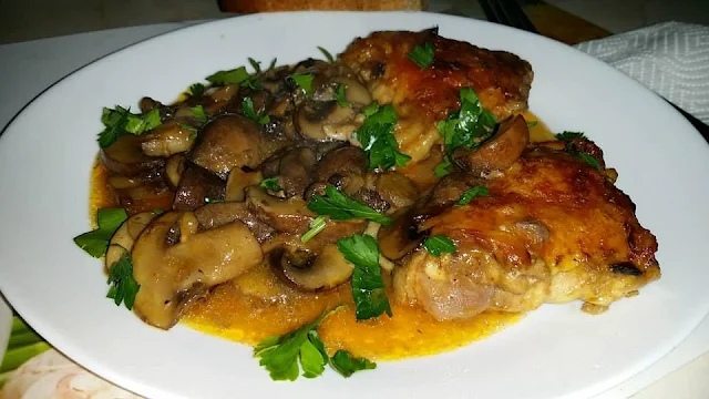 След 60 мин. тавата с пилешкото месо се изважда от фурната, маха се фолиото, добавят се гъбите и се запича за още 20 мин. на същата температура. Накрая по желание се поръсва с магданоз или копър, поднася се парче пиле, част от гъбите и се полива с образувалия се сос от печенето.